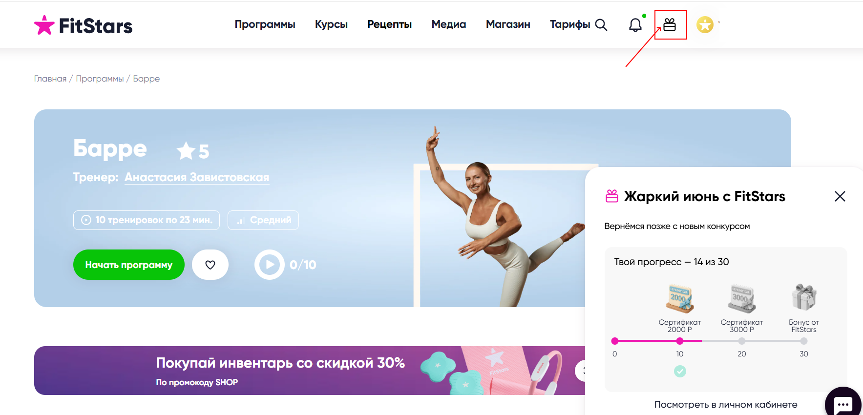 • за 30 выполненных тренировок — главный подарок со 100% скидкой. Количество ограничено.